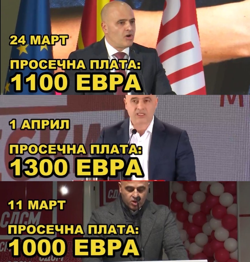 Лидерот на СДСМ Димитар Ковачевски за само 20 дена три пати ,,ја зголеми” просечната плата односно дава три различни ветувања.