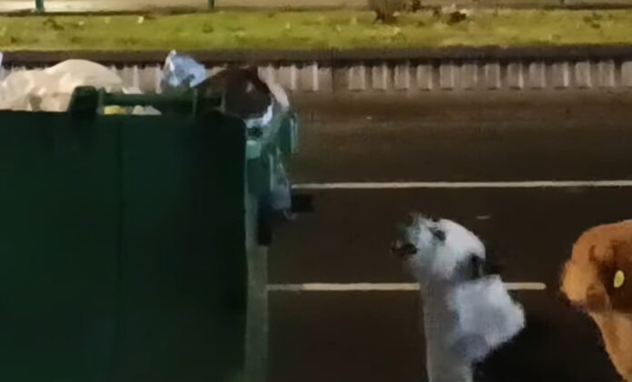 Мачката не се уплаши од двете кучиња кои што сакаа да станат нови ,,газди” на скопскиот контејнер и не попушти.