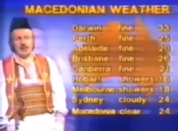 Акаунтот „Солкригер“ на социјалната мрежа Икс сподели вонвременско видео од 1980-тите, во кое Македонец од Егејска Македонија во народна носија соопштува временска прогноза на австралиска телевизија на дијалект на македонскиот јазик од просторот меѓу Кукуш и Лерин.