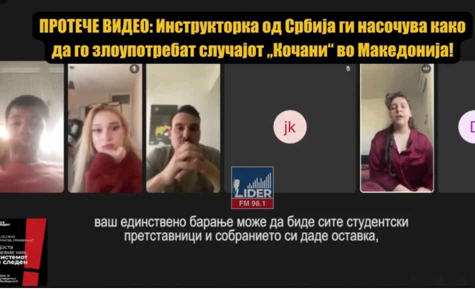 Во јавноста протекоа видео-снимки од онлајн сесија преку платформата „Зум“, кои укажуваат на сериозен обид за политичка манипулација и злоупотреба на трагедијата во Кочани. Во видеото се гледа како инструкторка за протести од Србија ги насочува студентите како да го злоупотребат случајот „Кочани“ во Македонија!