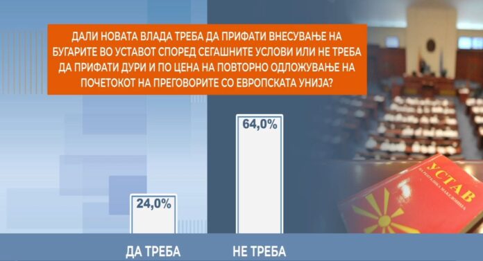 Безмалку две третини, поточно 64 проценти од македонските граѓани со негативен одговор на прашањето „дали новата влада треба да прифати внесување на Бугарите во Уставот според сегашните услови или не треба да прифати дури и по цена на повторно одложување на почетокот на преговорите со Европската унија“ во анкетата на „Детектор“ на ТВ Сител.