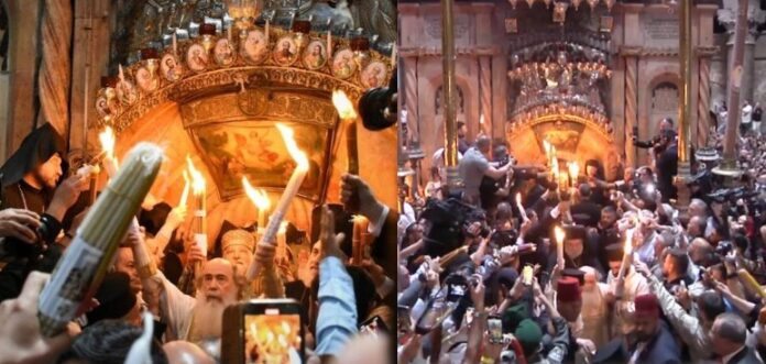 Видео-снимка на јутуб-каналот на „Ортодокс тајмс“ од церемонијата на спуштањето на Благодатниот оган и Светата светлина денес, 19 април 2025 година, на Велика Сабота, во црквата на Светиот гроб во Ерусалим, во Израел