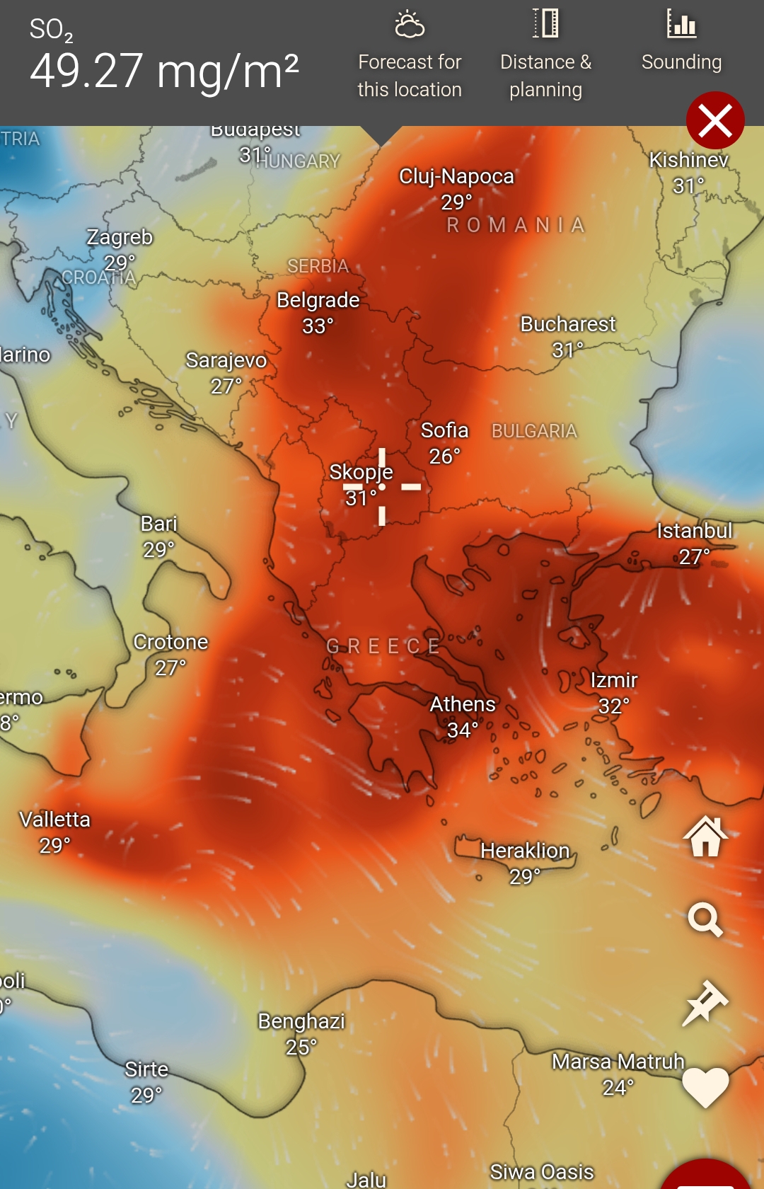 Од облакот полн со штетниот Сулфур диоксид утрово најизложени се Србија, Црна Гора, Косово, Македонија, Албанија, Бугарија и Романија, заедно со Грција и Турција, каде што се наоѓаат најголемиот дел од штетните аеросоли и лебдат во воздухот што го дишат граѓаните.