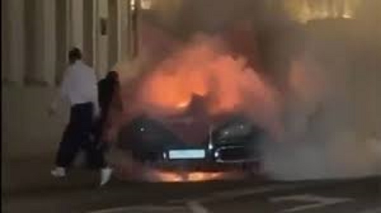 На видеата се гледа дека пожарот кој избувнал во моторот на „аурус сенат“ вреден близу 330.000 евра се проширил и во внатрешноста на возилото.