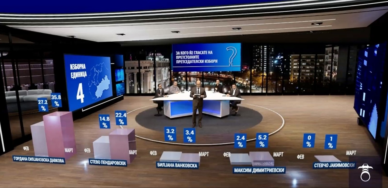 Во ИЕ 4 на прашањето за кого би гласале на претседателските избори во февруари 27,2 проценти се изјасниле за Силјановска, а во март рејтингот на Силјановска бил 35,8 проценти. За Стево Пендаровски во февруари се изјасниле 15,8 проценти, а во март рејтингот му бил 22,4 проценти. За Ванковска во ИЕ 4 во февруари се изјасниле 3,2 проценти од испитаниците, а во март 3,4 проценти. Рејтингот на Максим Димитриевски во ИЕ 4 во февруари бил 2,4, а во март 5,2 проценти. За Јакимовски во ИЕ 4 се изјасниле еден процент од испитаниците. Османи и Таравари и во ИЕ 4 во март се под еден процент. Во ИЕ 4 за ниеден кандидат во февруари рекле 13,8, а во март 12,5 проценти. Не знаеле или немале одговор за кандидатите во ИЕ 4 во февруари 12,7 проценти, а во март 6,2 проценти. Во ИЕ 4 не сакале да кажат за кој кандидат во февруари 9,5 проценти и во март 12,6 проценти од испитаниците.