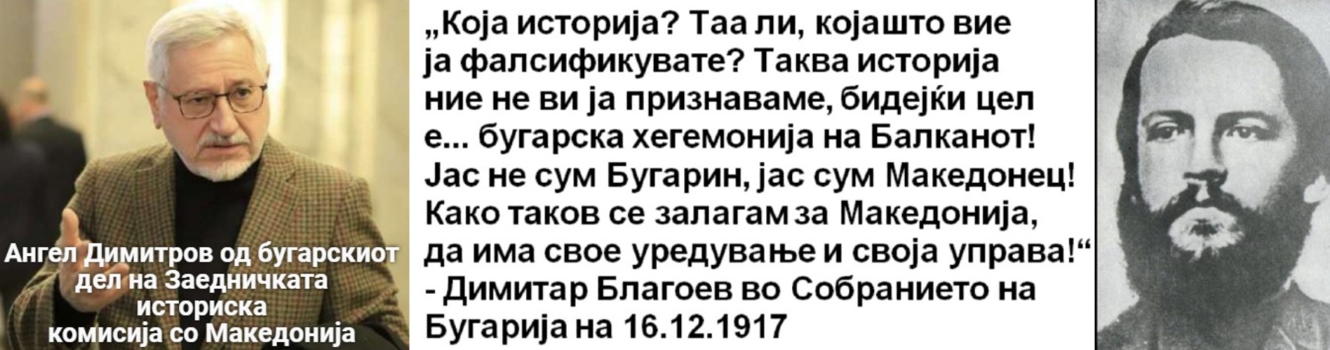 Но, еве сега продолжение на темата „заедничка историја со Бугарија и Бугарите“, но во вид на едно потсетување на исклучително важен настан од историјата, кој фрла силно блескава светлина на вистината околу „заедничката историја“, која официјална Софија сака да ја изнуди од Македонија. На 14 јуни 1856 година е роден Македонецот Димитар Благоев, од македонското село Загоричани, Егејска Македонија, денес во Грција. Тој бил македонски политичар во Бугарија и основач на Бугарската работничка социјалдемократска партија (БРСДП). Во срцето на бугарската држава, во нејзиното Народно собрание на 16 декември 1917 година Благоев бележит говор, кој ги разоткрил уште пред 108 години исцело сите, па и овие денешни обиди за фалсификување и присвојување на македонската историја, за нејзино прикажување како бугарска историја.