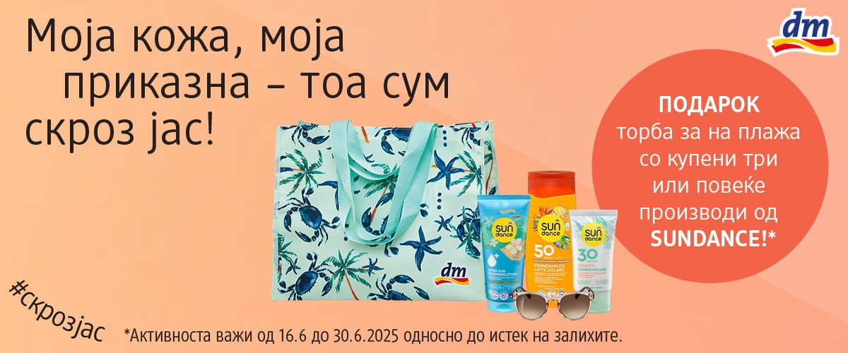 Летото е тука, а со него и моментите на опуштање под сончевите зраци! Ова лето, dm ви нуди уникатна можност да ја направите вашата авантура на плажа уште поубава. Со купување на 3 или повеќе производи за заштита од сонце и очила на Sundance, добивате подарок – убава и практична торба за плажа!