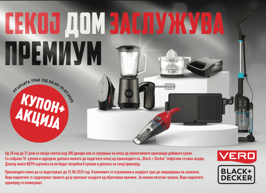 Секој дом заслужува премиум е новата купон плус акција која започна денес и трае до 31 јули. Со секоја сметка над 300 денари или со купување на некој од промотивните производи добивате купон. Со собрани 10 купони и одредена доплата секој потрошувач ќе може да подигне некој од производите на Black + Decker. Потрошувачите кои имаат ВЕРО клуб картичка со собрани 8 купони и одредена доплата ќе може да подигнат еден од апаратите за домаќинство по сопствен избор.