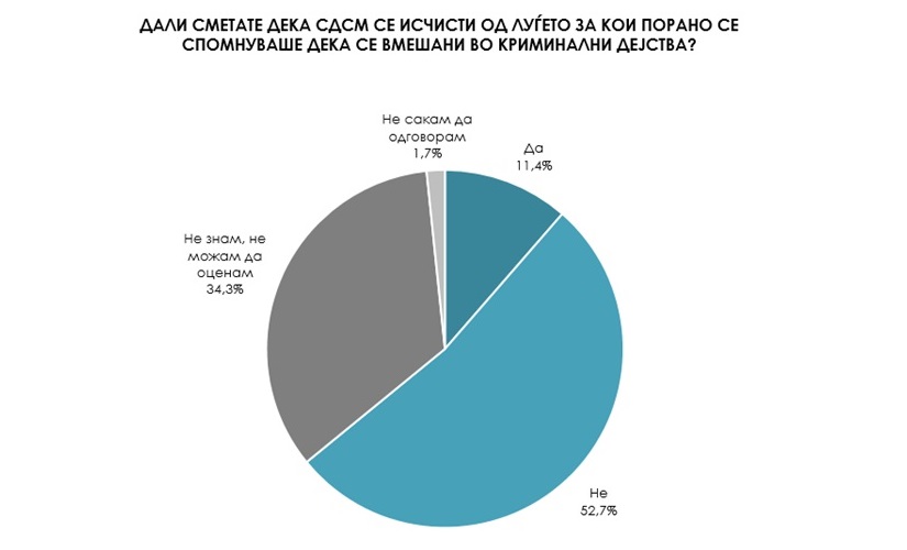 По притворите и криминалот во мкој е фатен СДСМ и нивни челници и функционери вмешани во криминални и коруптивни зделки, повеќе од половина од испитаниците сметаат дека СДСМ сѐ уште не се исчисти од луѓето кои се дел од такви скандали. 52,7 се со тој став, дека се исчистиле верува само членството на СДСм, околу 11 насто…