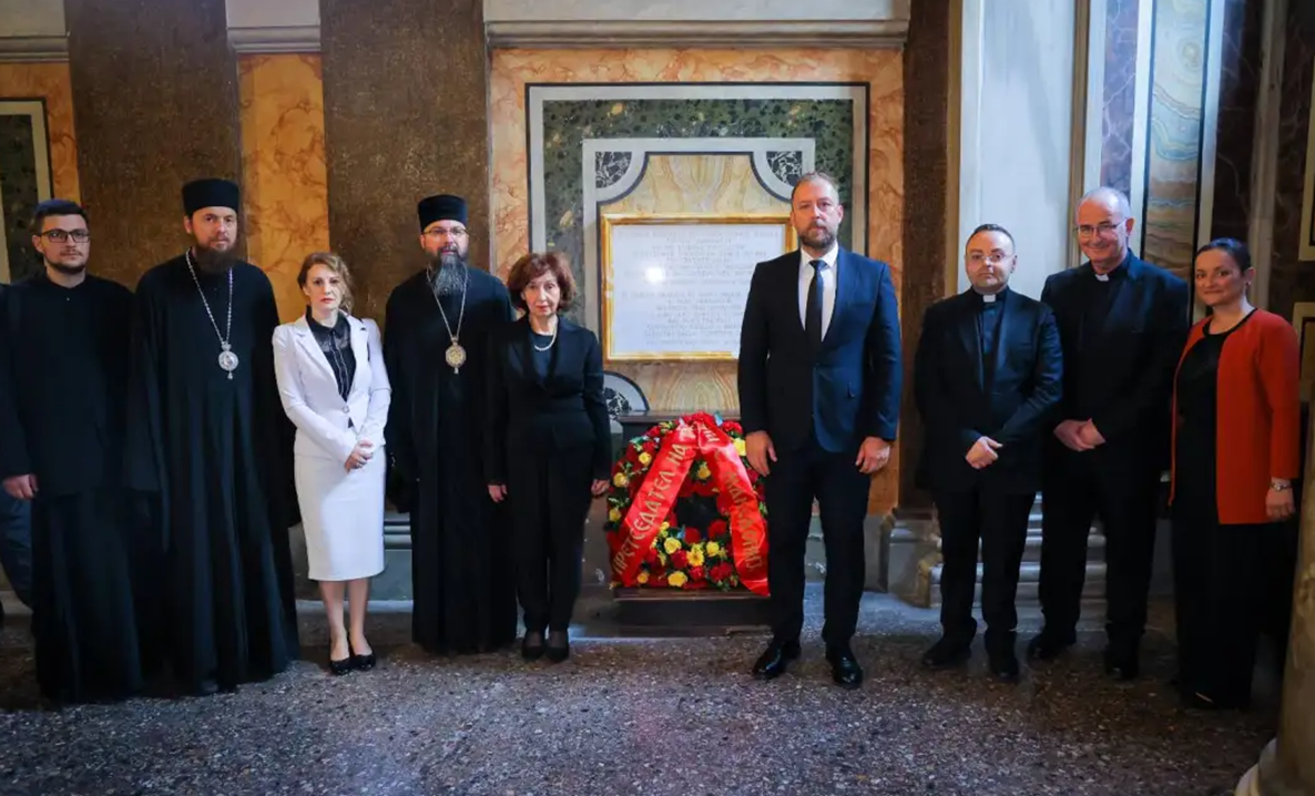 - Тоа е место што зрачи со духовност, а дополнително кога ќе чуете молебен од прекрасни, посветени, млади, убави свештеници тогаш верата уште повеќе се зајакнува и тоа е момент на духовност, истакна претседателката Силјановска – Давкова, која заедно со државно-црковната делегација денеска ја посети базиликата „Санта Марија Маџоре“, каде што положи венец на спомен-плочата на македонски јазик во чест на делото на светите браќа Кирил и Методиј.