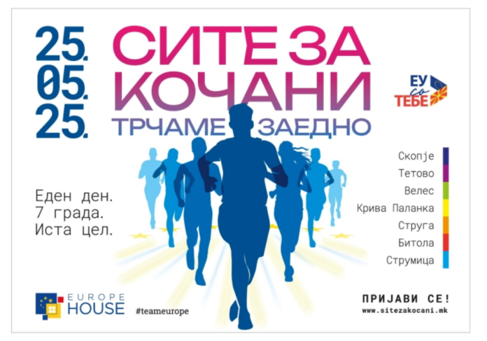 • На 25 мај, истовремено во седум града – Скопје, Струмица, Крива Паланка, Битола, Велес, Струга и Тетово, ќе трчаме заедно со една единствена цел: да му подадеме рака на Кочани. „СИТЕ ЗА КОЧАНИ – ТРЧАМЕ ЗАЕДНО!“ е хуманитарна иницијатива во која може да учествува секој, без разлика на возраста или физичката подготвеност. Трките се наменети за сите: рекреативци, спортисти, аматери, помлади и повозрасни, бидејќи не се работи за километри, туку за солидарност, наведуваат од Делегацијата на ЕУ.