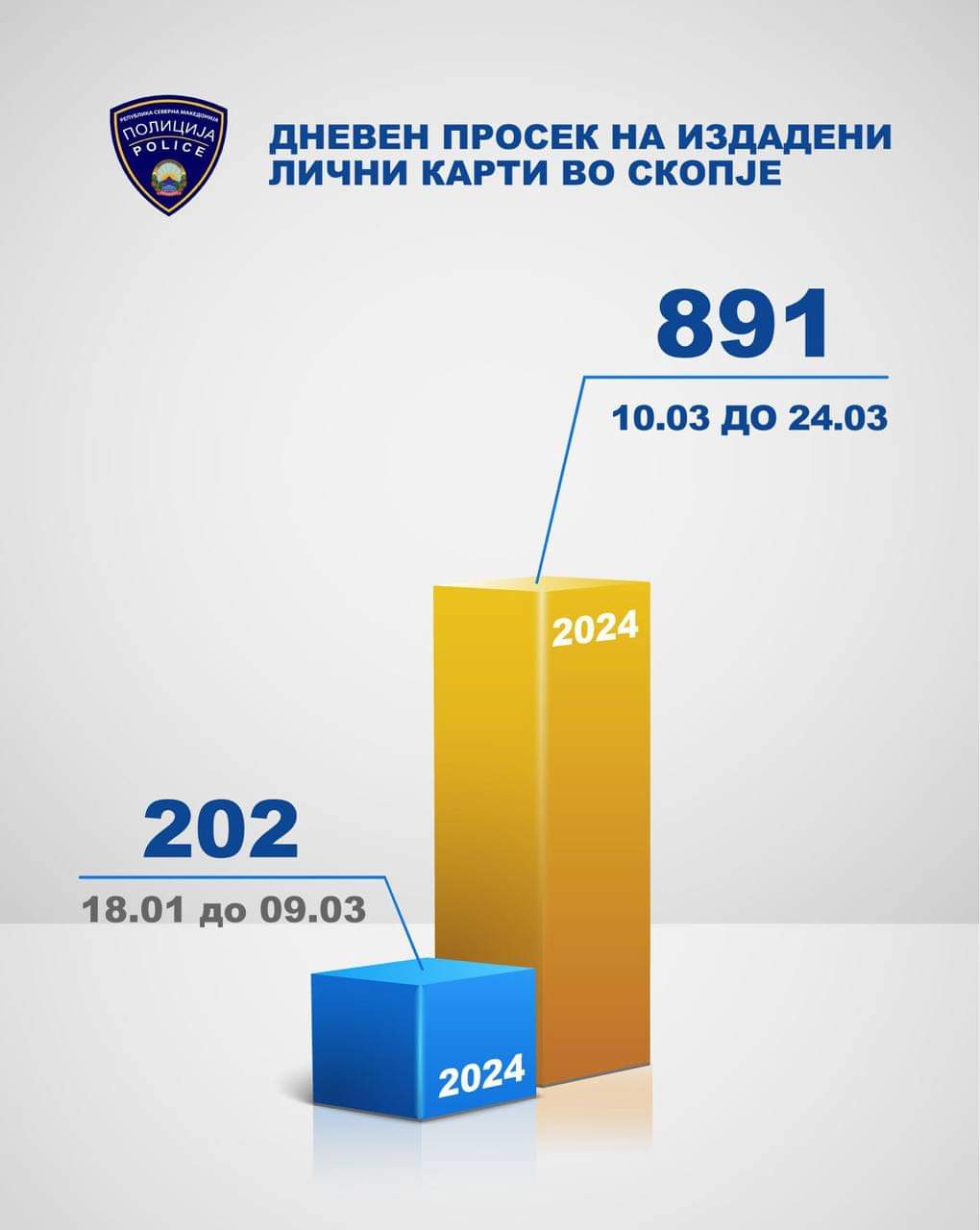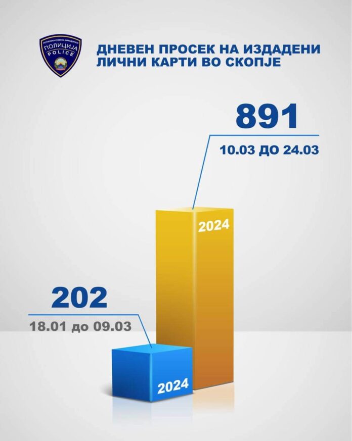 Во тој контекст за само две недели доставени се вкупно 12476 лични карти, односно во просек по 891 дневно, што е четири и пол пати повеќе во однос на претходно кога за период од 50 дена (18.01.2024 – 09.03.2024г.) биле доставени 10100 лични карти, односно 202 дневно.