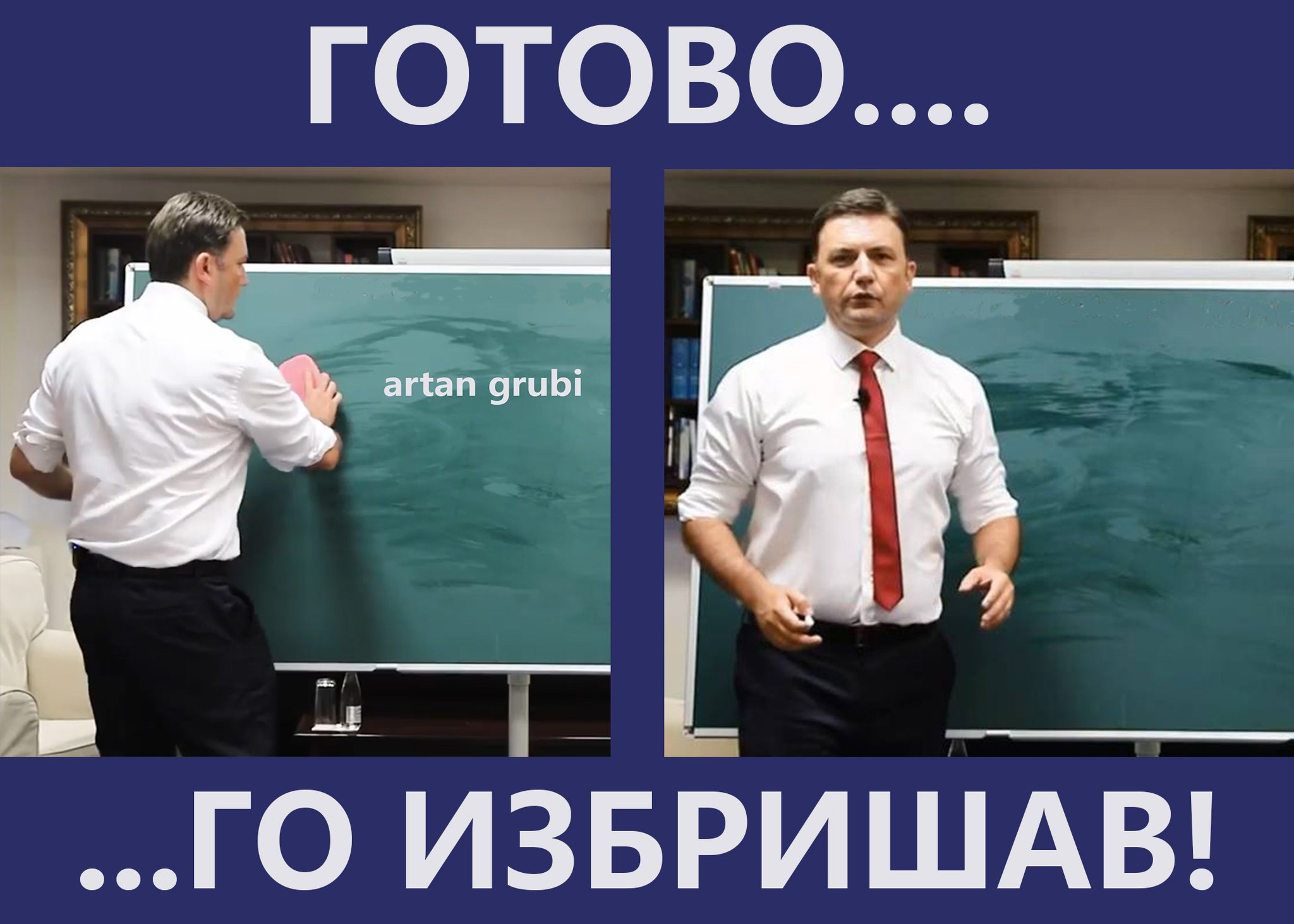 Славната табла на која тогашниот министер за надворешни работи Бујар Османи им црташе на Македонците колку е супер Францускиот предлог послужи за фотомонтажата на денот во која истиот цртач го брише партискиот колега и донеодамнешен „прв вицепремиер“ Артан Груби по ставањето на црната листа на САД.