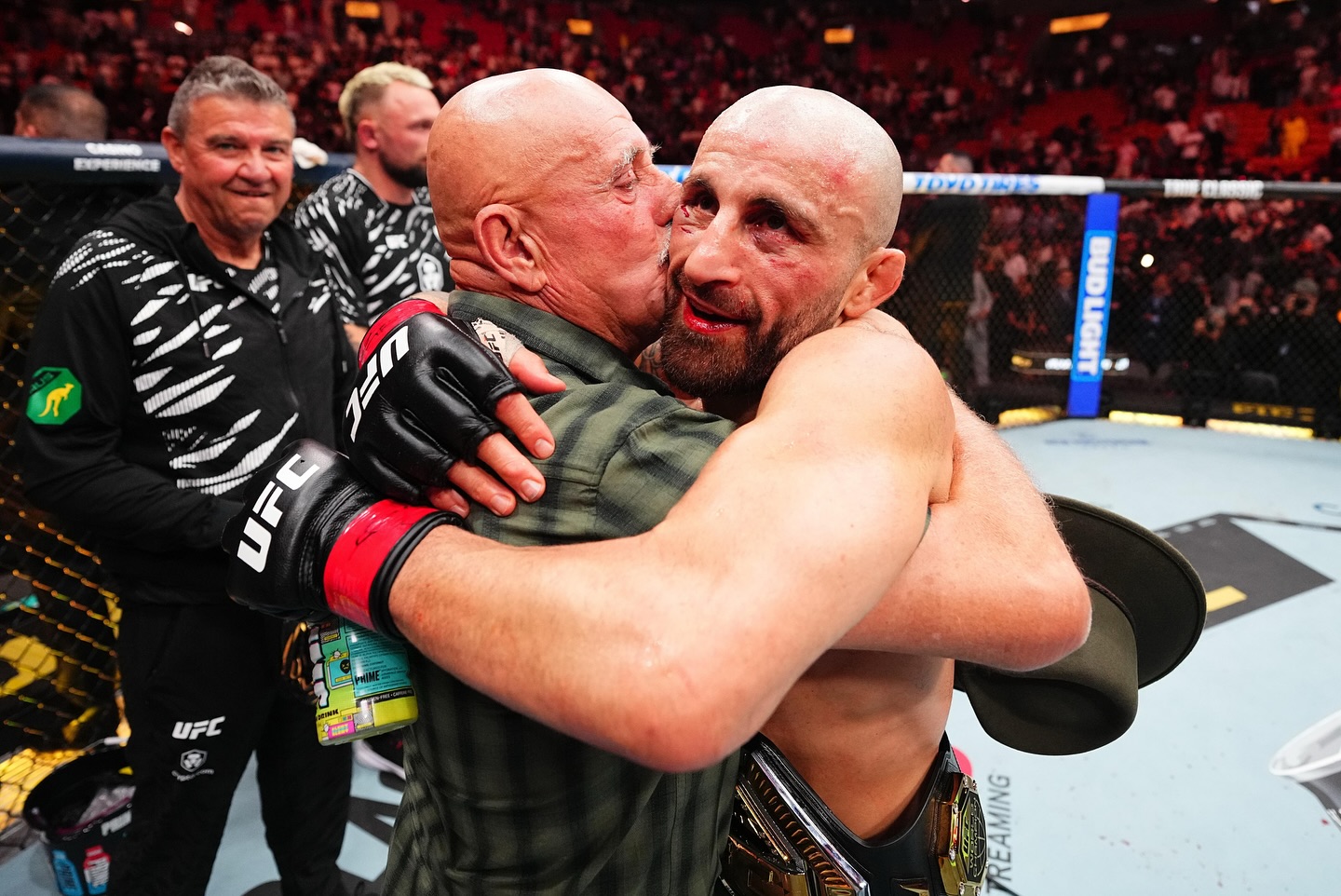 Тоде Волкановски го следи во чекор својот син Александар „Велики“ Волкановски, па така беше и во Мајами, кадешто австралискиот ултимејтфајтер од македонско потекло си го врати шампионскиот појас во перолесна категорија, па гордиот татко му честита со прегратка и бакнеж во октагонот по триумфот над Диего Лопес од Бразил.