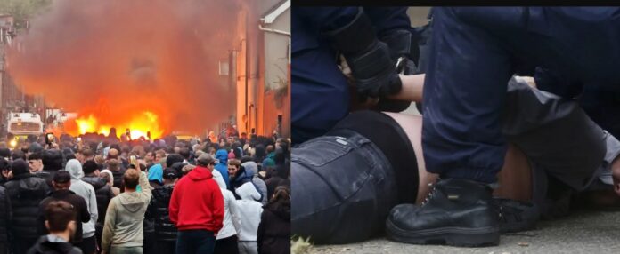 Улиците во центарот на градот Балимена, се претворија во хаос во понеделникот вечерта, кога маскирани млади луѓе нападнаа полициски возила и фрлаа проектили кон полицајците, некои палејќи згради и кршејќи прозорци. Снимките од насилните сцени прикажуваат куќи во пламен. Во едно видео, маскиран маж беше виден како фрла предмет кон полициски комбиња додека толпата гледаше.