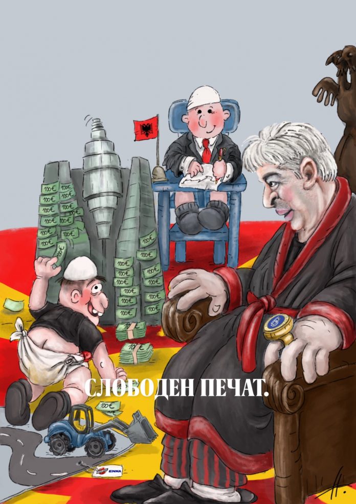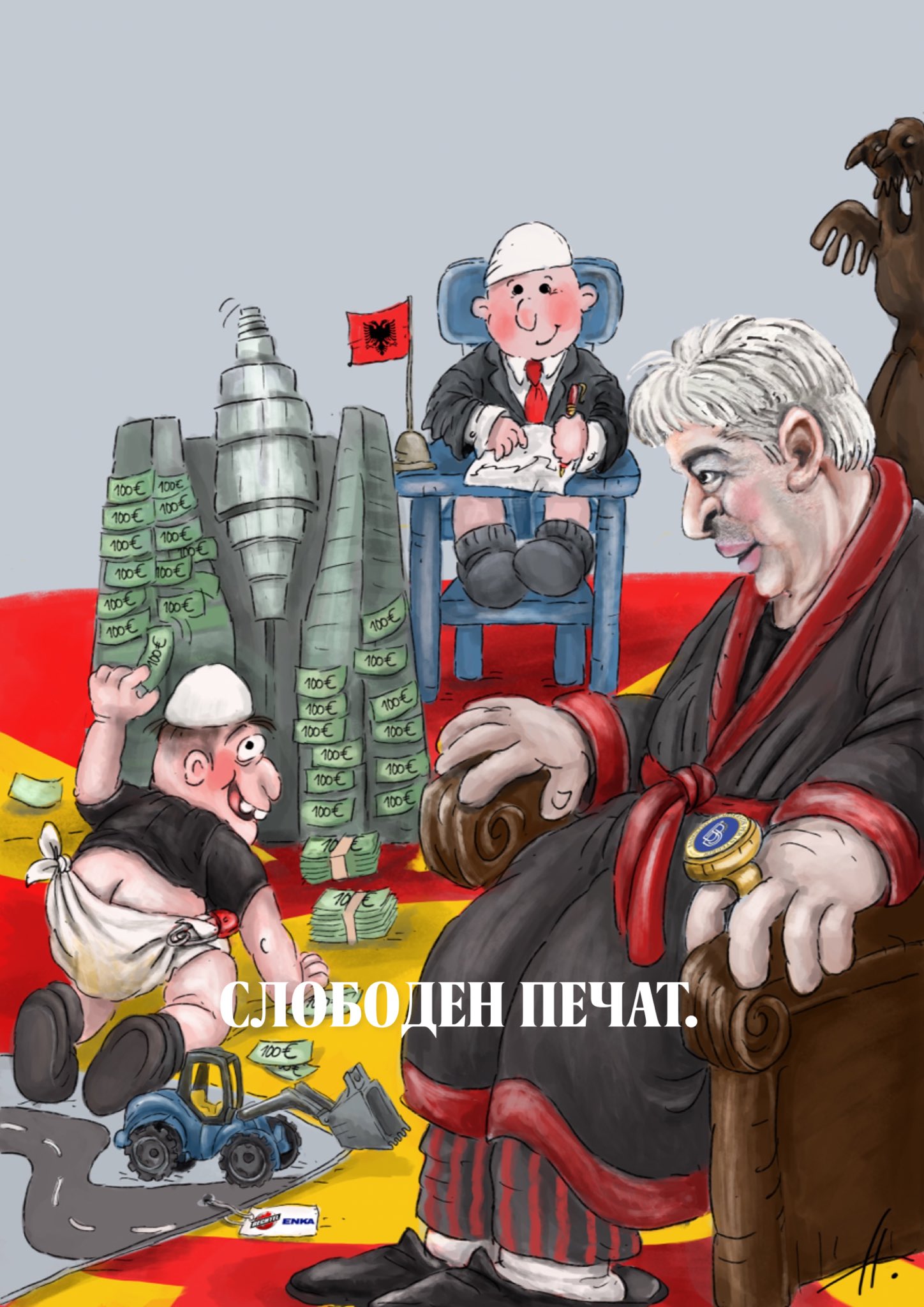На цртежот на Наташа Костовска за Слободен печат се гледа Али Ахмети како седи во фотеља и набљудува мали деца како ѕидаат згради налик на ТЦ Соравија со пари кои можат да бидат и државни.