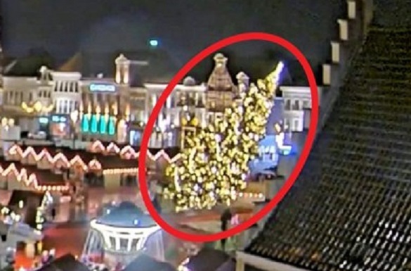 Остана нејасно дали огромната, празнично украсена елка билае лошо обезбедена. Видеата покажаа дека дрвото драматично се ниша на ветрот пред да падне.
