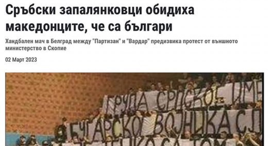Имено, весникот под наслов “Српски запаленковци ги навредија Македонците дека се бугари“, информираше за ракометниот натпревармеѓу белградски „Партизан“ и скопски „Вардар“ на кои „гробарите“ истакнаа транспарент на трибините на кој пишуваше „Група со српско име слави бугарски војник, мора да е тешко со таков комплекс во главата!?“ Навивачите притоа скандираа Јужна Србија, никогаш Македонија.