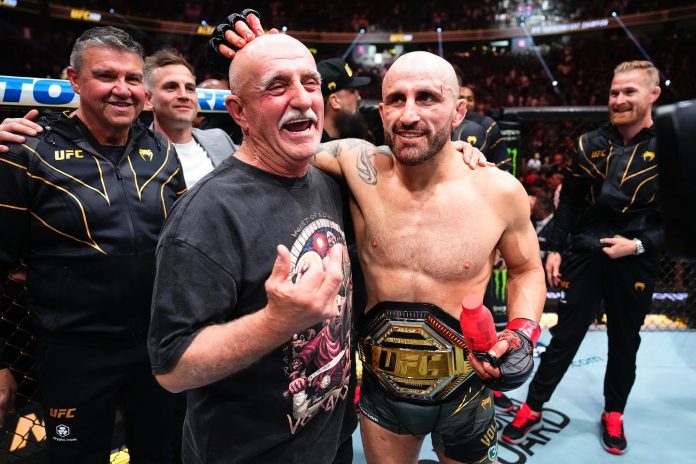 Австралискиот ултимејтфајтер со македонско потекло Александар „Велики“ Волкановски во фотографијата на денот е во прегратките на својот татко Тоде по обединувањето на титулата светски шампион во перолесна категорија.