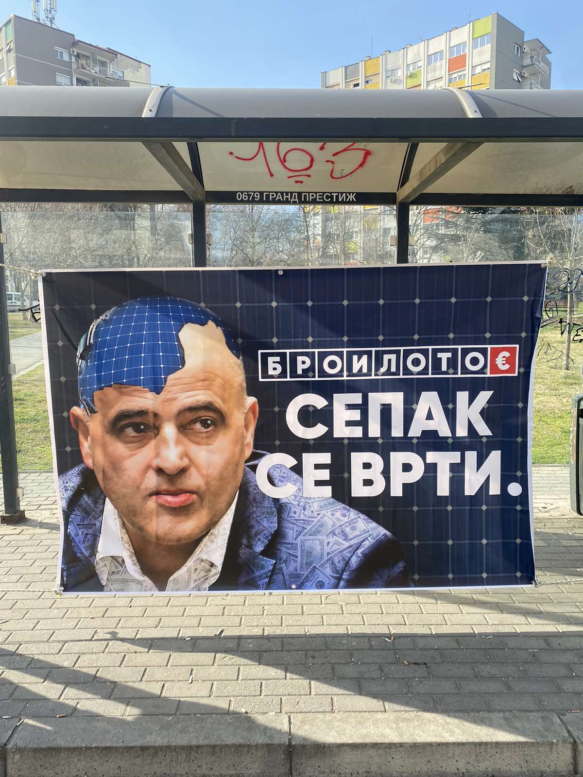 Во близина на домот на Ковачевски се појави ваквата герила, на платно каде има потсетување дека и во кризните времиња броилото за пари на премиерот сепак врти.