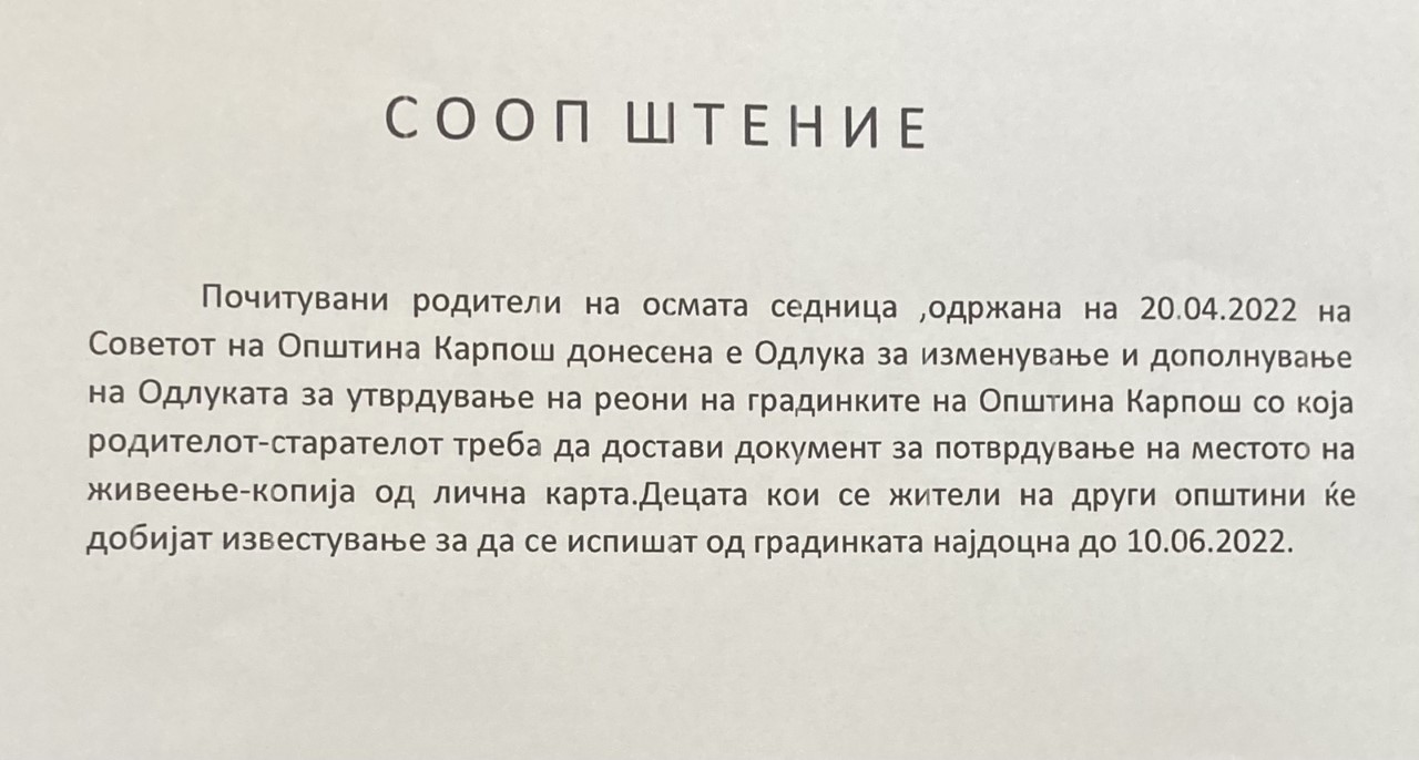 Група родители кои не се жители на општина Карпош, а чии деца одат во градинки во оваа општина, добиле известување дека децата ќе бидат отпишани на 10 јуни.