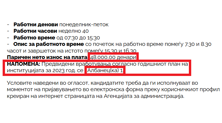 Професорката Мирјана Најчевска реагира на Оглас на Агенцијата за администрација во кој за место „Виш советник за техничка, оперативна и логистичка поддршка, Сектор за општи и нормативни работи(1) е поставен и дополнителен услов покрај степенот на образование, комјутерските вештини, познавање на странски јазик и.т.н. односно дека однапред е обезбедено за Албанец(ка).