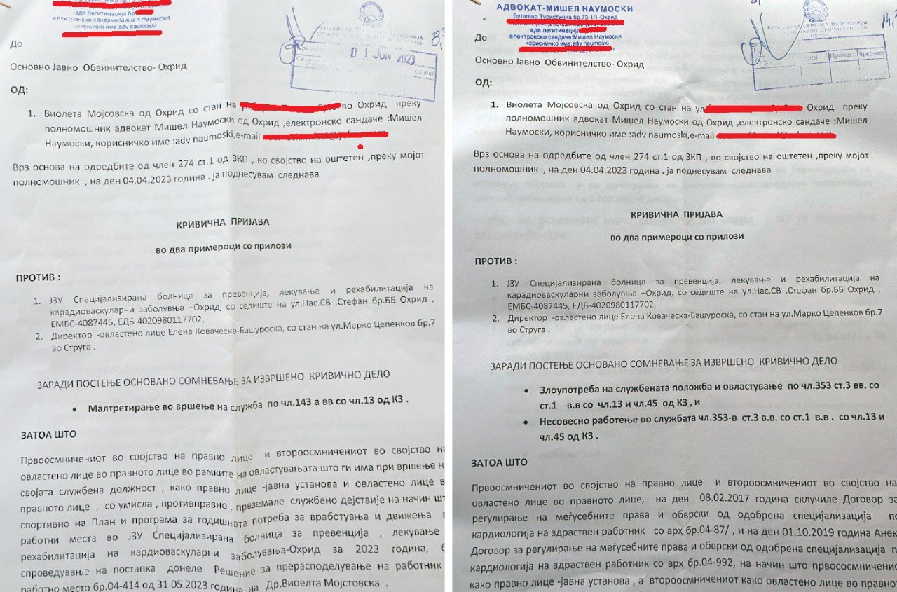 Поради сето ова против директорката на кардиолошката болница во Охрид Елена Коваческа-Башуровска се поднесени две кривични пријави за малтретирање во вршење на служба, злоупотреба на службената положба и овластување и несовесно работење со службата.