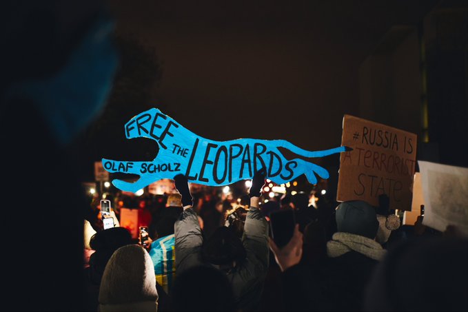 „Ослободете ги леопардите“, гласеше една од пораките на транспарентите на демонстрантите меѓу кои имаше и Украинци, упатена до германскиот канцелар Олаф Шолц.