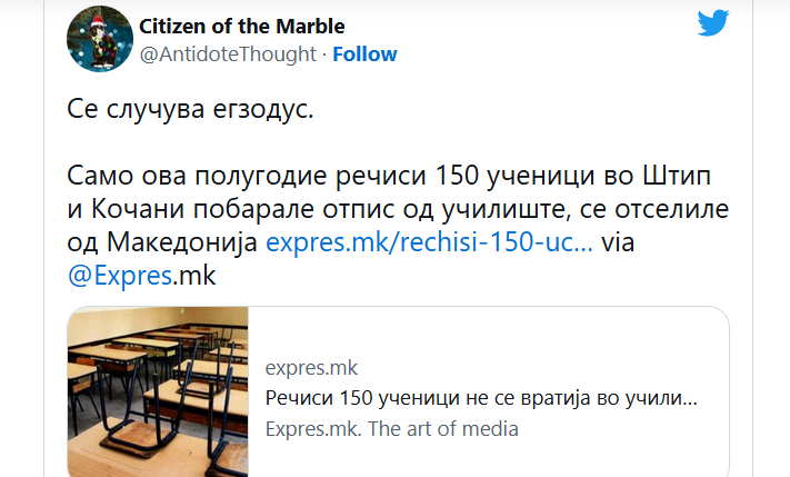 Тоа значи дека од овие два града се иселиле околу 1,5 проценти од учениците само во едно полугодие. Во основните училишта во Штип има околу 4.000 ученици, а во средните околу 2000. Пред две децении во основните училишта во Штип имало над 5.200 ученици.