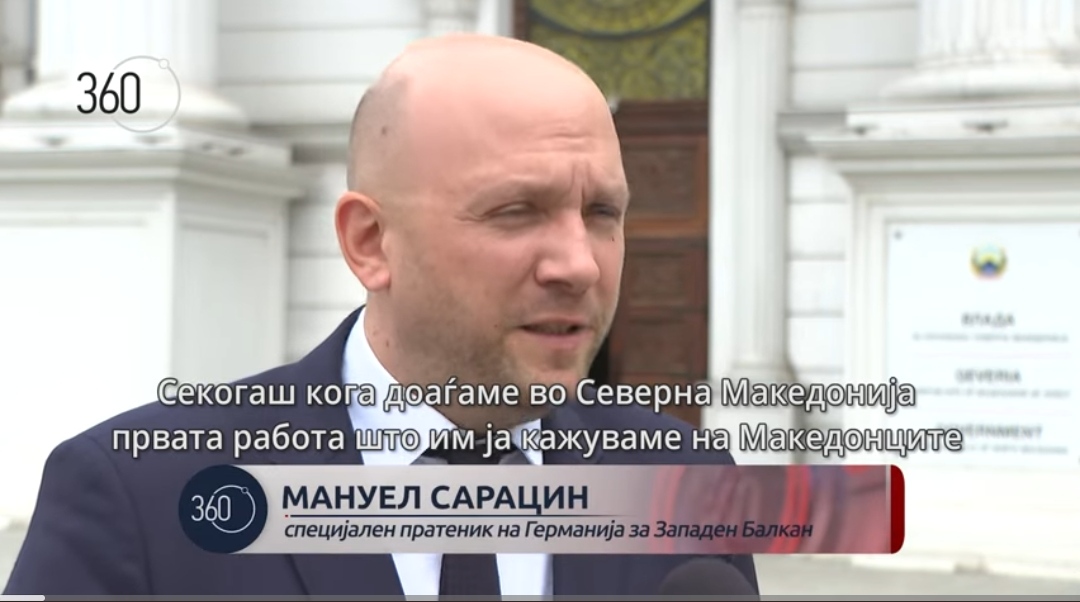 ,,Свесни сме за чувствата, има многу стравови за идентитетот, културата, јазикот, но ве уверуваме дека Германија го следи тоа, Германија верува во македонската култура, во македонскиот јазик и Германија знае за македонскиот идентитет и сето ова го гледаме како пат кон иднината во ЕУ”, вели специјалниот германски пратеник за Западен Балкан, Емануел Сарацин, во краток разговор за „360 степени“.