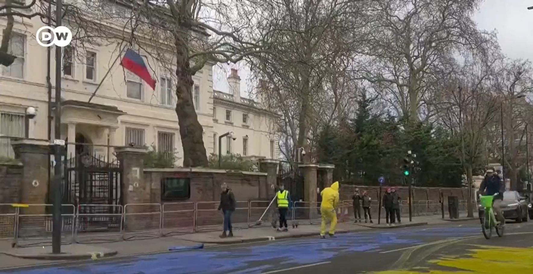 Во стилот на „Шарената револуција“ во Скопје пред седум години, улицата пред Амбасадата на Руската Федерација во Лондон денеска ја бојосаа во сино-жолтата боја на знамето на Украина, предизвикувајќи тешкотии во одвивањето на сообраќајот.
