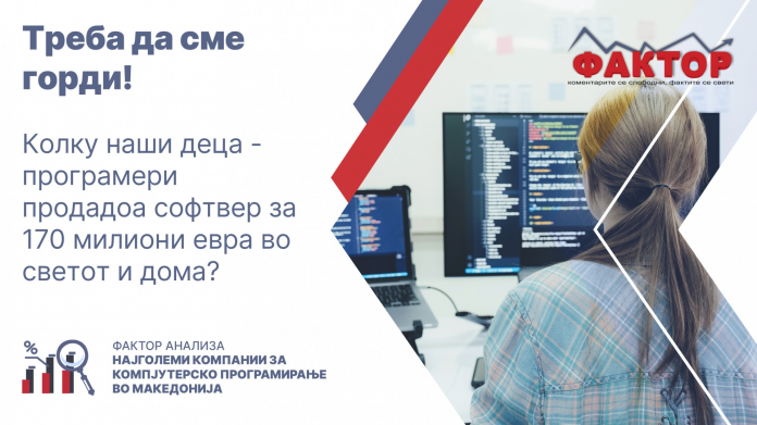Нашата земја има мала „армија“ програмери! Во Македонија лани 3.500 наши деца, вработени во повеќе од 20 софтверски лани, „искуцале кодови“ и продале софтвер за 170 милиони евра, покажуваат официјалните бројки за најголемите македонски софтверски компании. А состојбата е уште подобра затоа што има значаен број програмери кои „фаќаат работа од дома“ и работат на светски проекти за софтвери како физички лица.