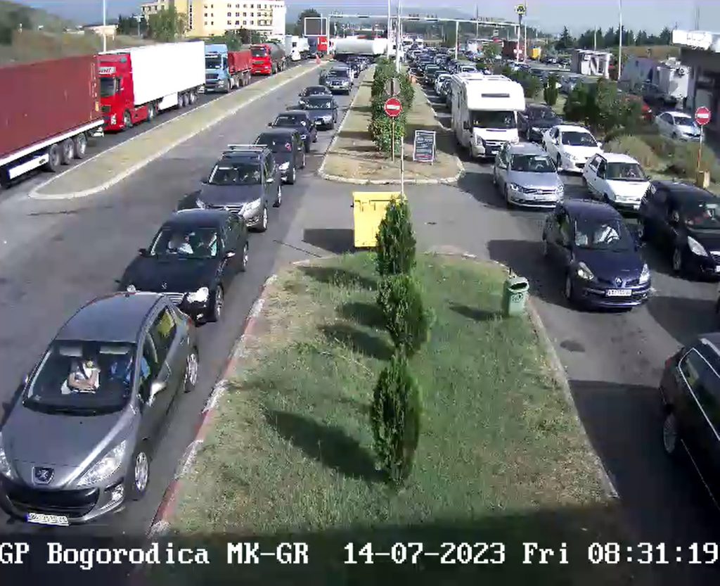 На камерите од граничните премини на Јавното претпријатие за државни патишта (ЈПДП), се забележува дека за влез во Грција од македонска страна на границата голем број возила кои чекаат распоредени во пет колони, од кои четири се со возила, а една со камиони.