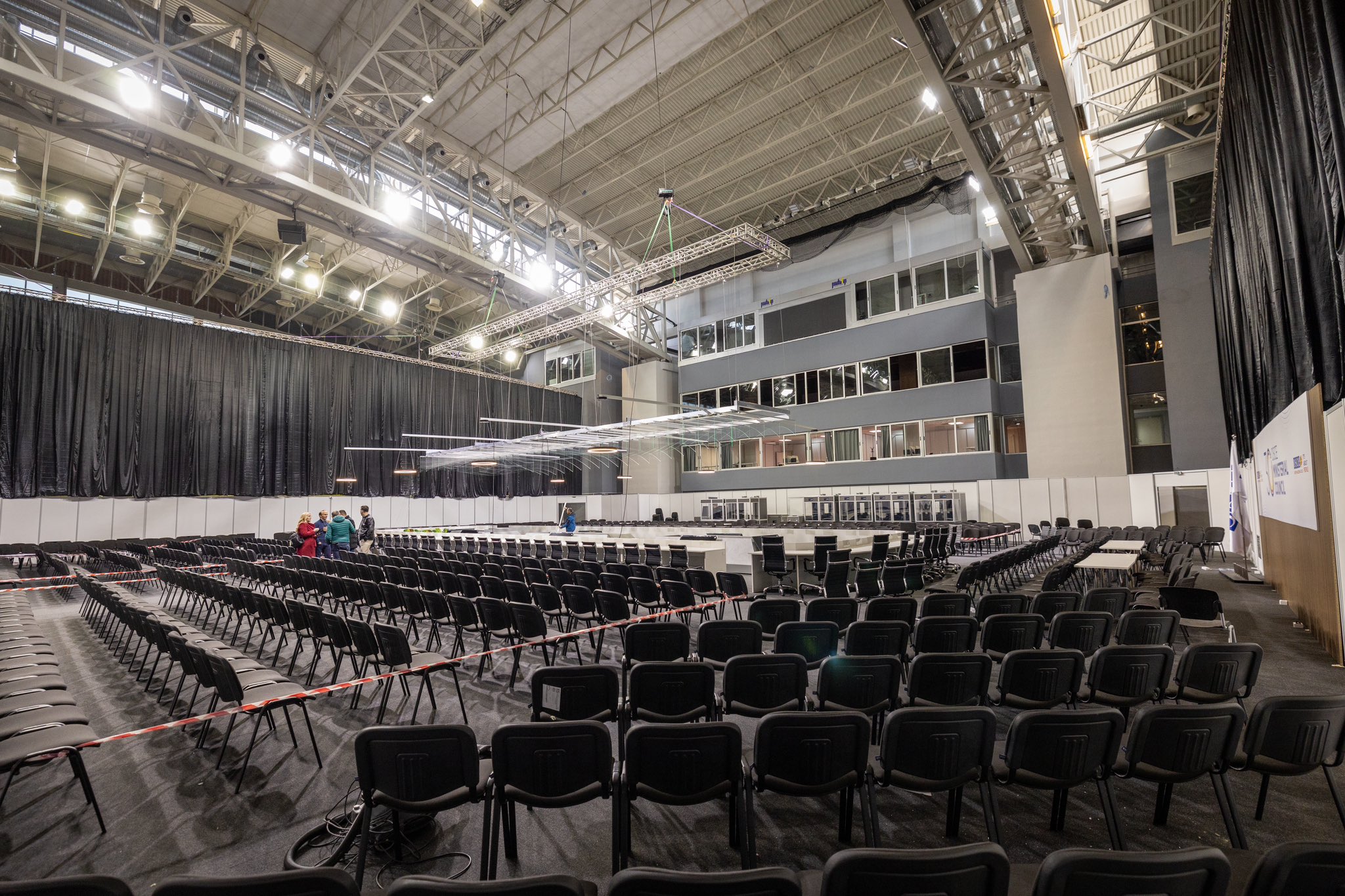 Од фотографијата се гледа дека градежната фирма „Еуровиа“ од Желино која го доби тендерот за преадаптација на Спортскиот центар „Борис Трајковски” за министерската конференција на ОБСЕ поставила завеси на делот каде седи публиката, теписон на теренот каде се играат натпревари и има поставено столчиња кои бездруго не се купени туку изнајмени.