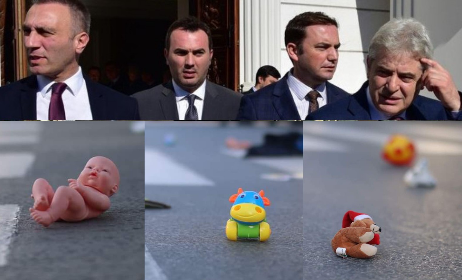 Затоа денеска симболично ги донесовме посмртните останки на семејствата кои во меѓувреме не напуштија. Секое семејство што побегнало поради овие корумпирани политичари оставило зад себе чанти, книги, тетратки и детски играчки, барајќи подобар живот за своите деца. Денеска овие овде му ги оставаме на сопственикот на Соравија, за да ги има како спомен на сите оние семејства што тој и неговите соработници ги избркаа од своите домови. Нека знае целата јавност дека само од 2002 година од Македонија се иселиле над 300.000 луѓе. Толку не чини богатењето на семејството Ахмети е Груби.