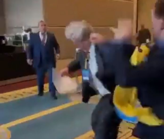 Украинскиот пратеник на насилството и одземеното знаме вратил со напад по што го удрил Русинот по лицето и почнала тепачка.
